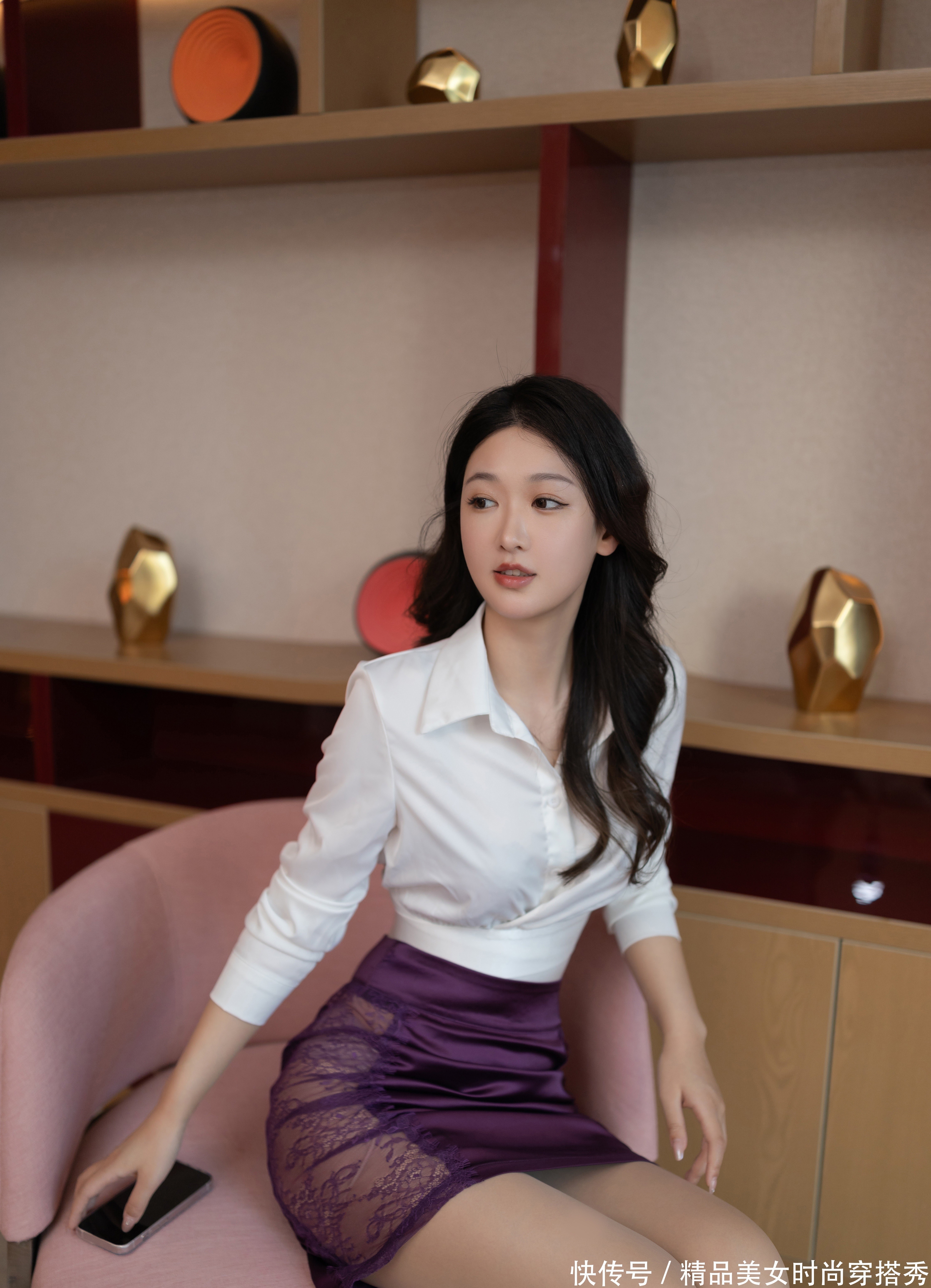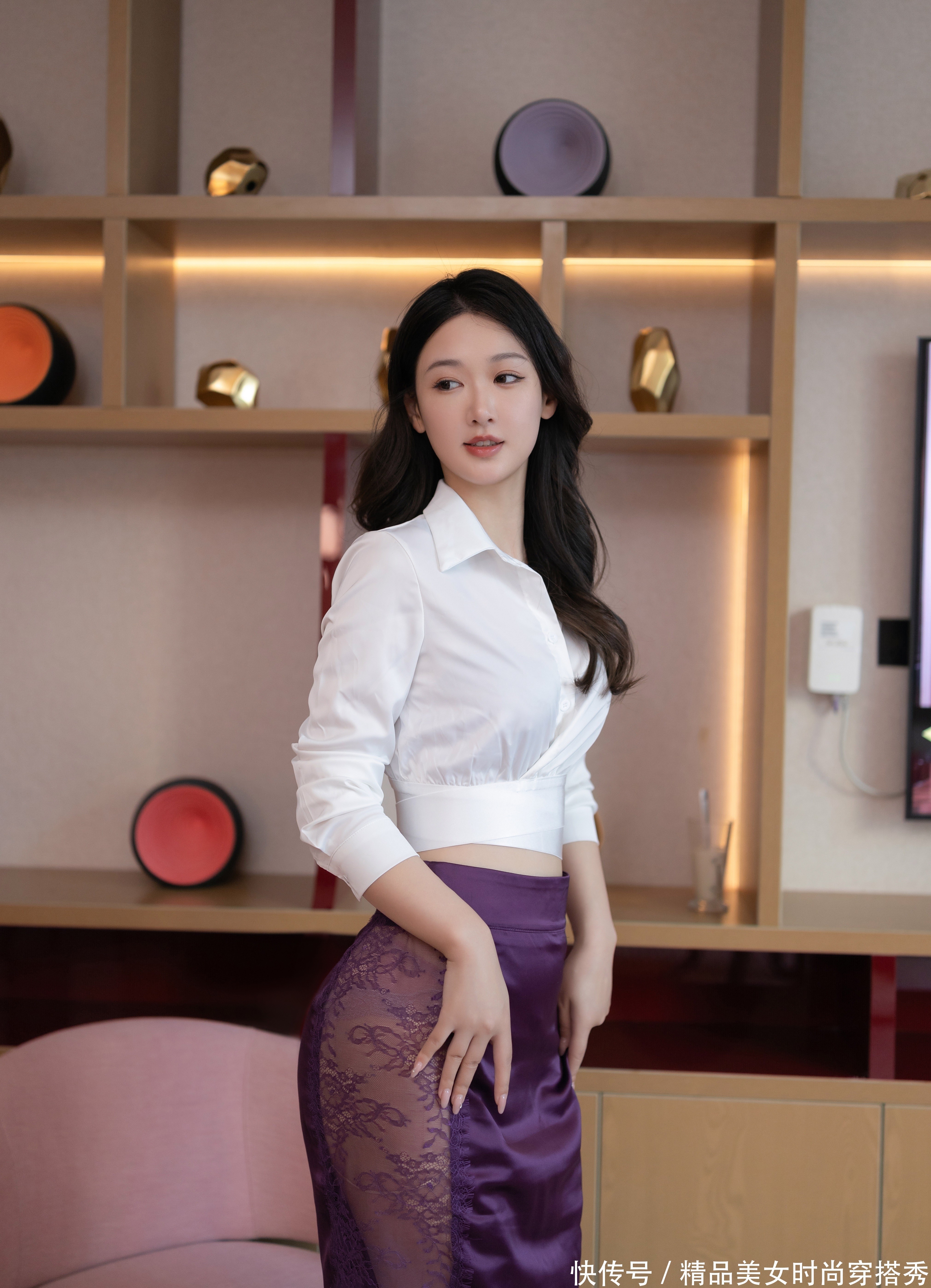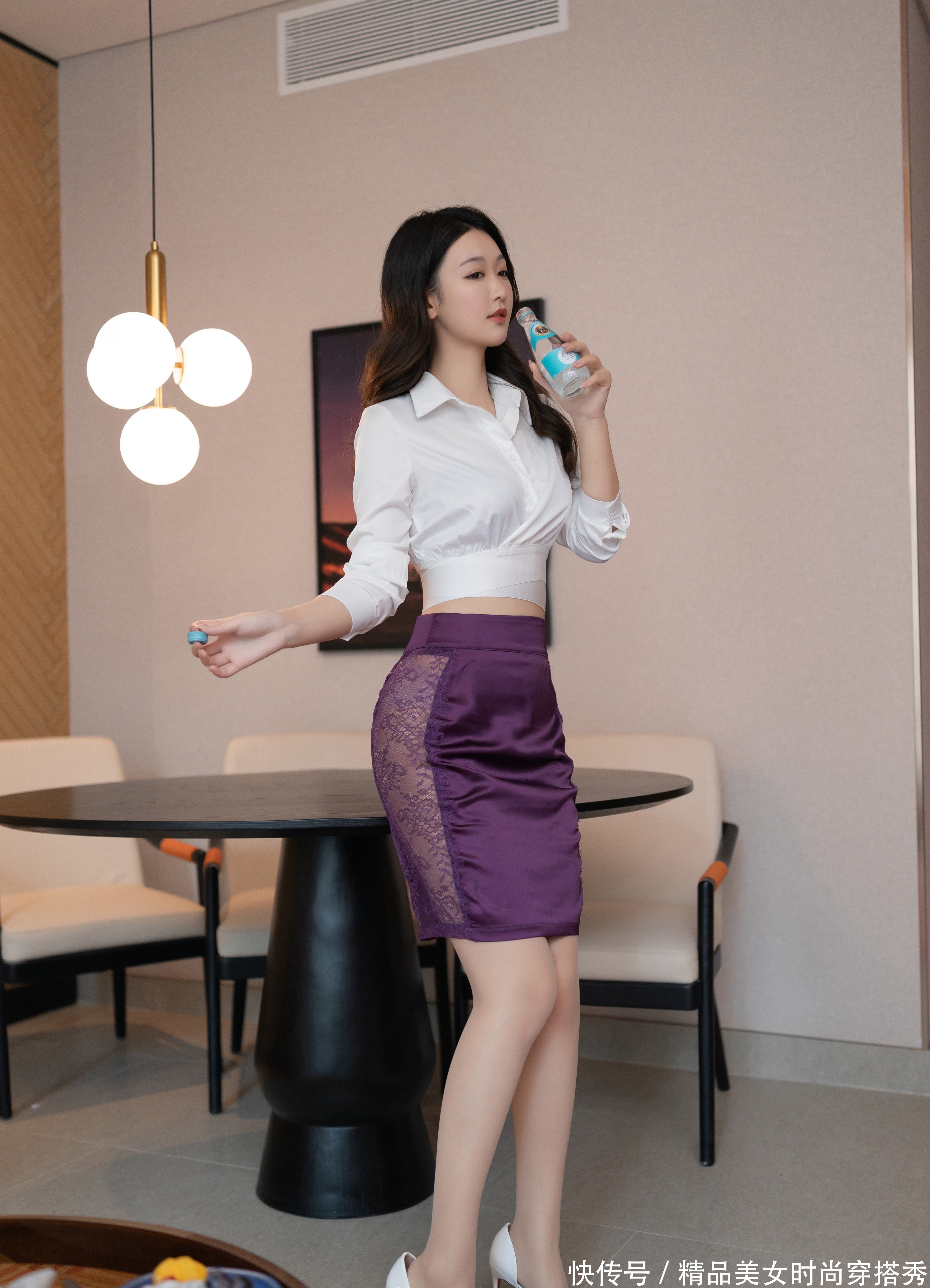 白衬衫简洁大方,凸显出她的干练与利落;紫色半裙则增添了一抹神秘与高贵,蕾丝拼接设计更是让整体造型多了几分性感与妩媚。